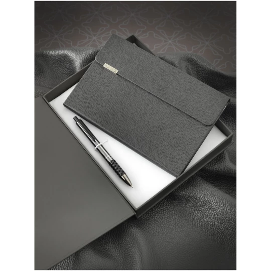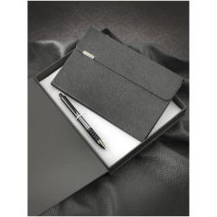 Notes o wyjątkowym wzornictwie (format A5) z okładką z termoplastycznego poliuretanu, czarną wstążką do zakładania stron, zapięciem magnetycznym i 80 arkuszami (80 g/m²) w linie. Zestaw zawiera długopis Tactical. Oba elementy zapakowane w pudełko upominkowe "LUXE". Rozmiar zeszytu: 13,5 x 20,5 cm. Długość długopisu: 14 cm. Średnica długopisu: 1,05 cm.