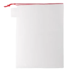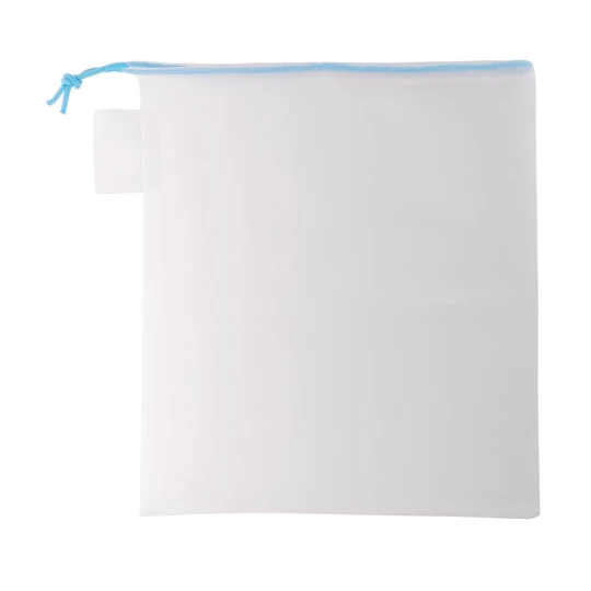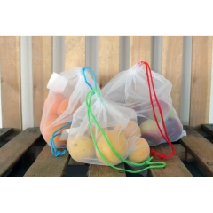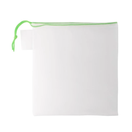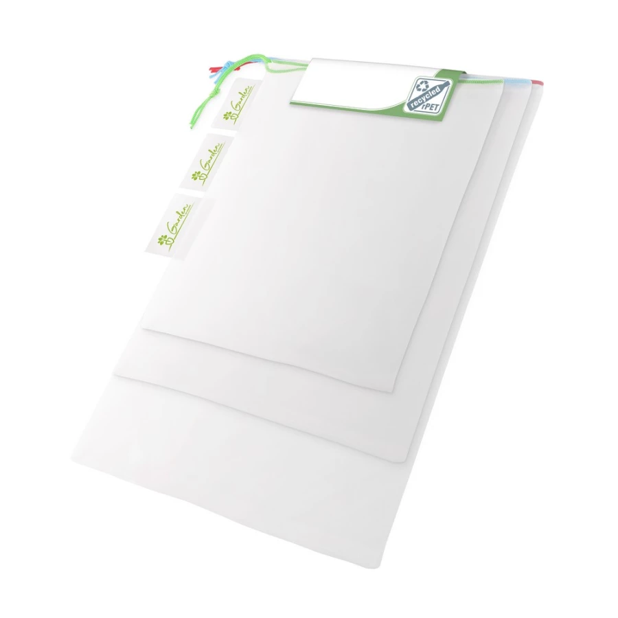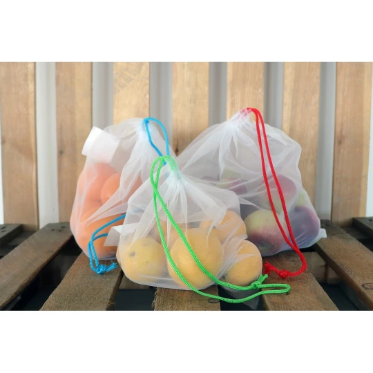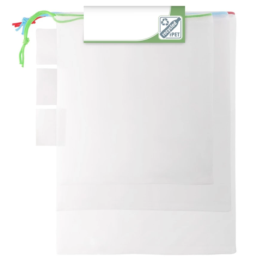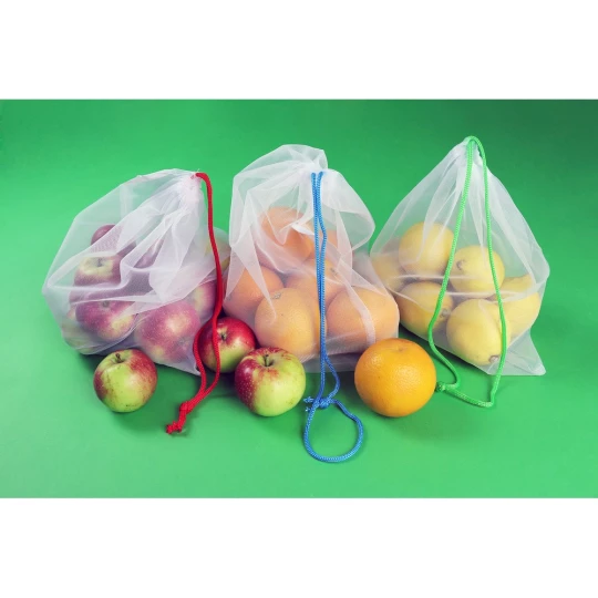 Zestaw 3 woreczków RPET na owoce i warzywa w różnych rozmiarach: 26 x 28 cm, 30 x 33 cm, 30 x 40 cm, przy każdym woreczku specjalna metka pod znakowanie