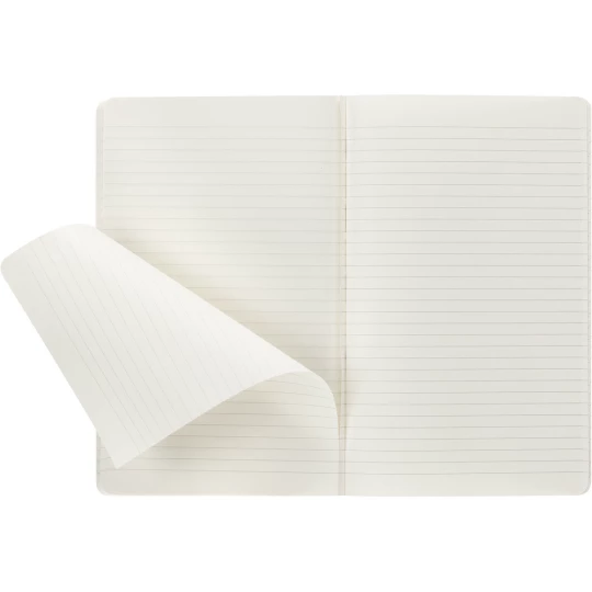 Duży zeszyt MOLESKINE Cahier Journal (ok. A5, large), 80 stron w linie, miękka okładka z widocznymi przeszyciami na grzbiecie, kieszeń wewnętrzna, ostatnie 16 kartek z perforacją umożliwiającą wyrwanie