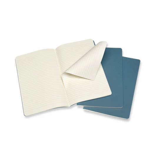 Duży zeszyt MOLESKINE Cahier Journal (ok. A5, large), 80 stron w linie, miękka okładka z widocznymi przeszyciami na grzbiecie, kieszeń wewnętrzna, ostatnie 16 kartek z perforacją umożliwiającą wyrwanie