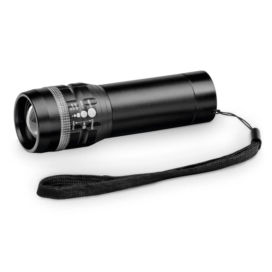 Aluminiowa latarka z funkcją zoomu z 3 trybami świecenia, lampką LED 1 W (60 lumenów) i uchwytem. Zawiera 3 baterie AAA. Dostarczana w pudełku prezentowym. ø33 x 103 mm | Pudełko: 115 x 43 x 40 mm