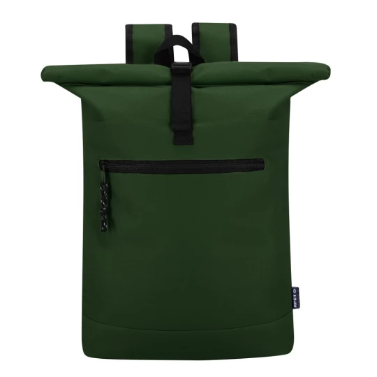 Zwijany plecak na laptopa 15", rozwijalna główna kieszeń zamykana na klamrę, która umożliwia zwiększanie pojemności plecaka oraz lepiej chroni przed czynnikami atmosferycznymi po zwinięciu, miękka przegroda na laptopa, przednia kieszeń na zamek błyskawiczny, miękki tył zwiększający komfort użytkowania i regulowane paski na ramię umożliwiające dopasowanie ich długości do własnych preferencji, produkt wykonany z poliestru 600D RPET