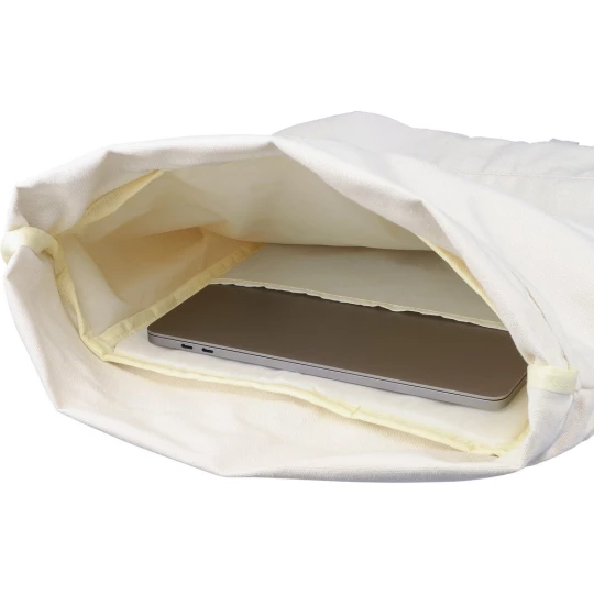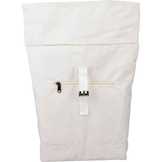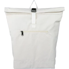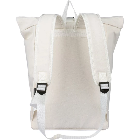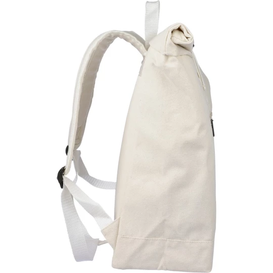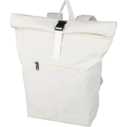 Zwijany plecak, pojemność 15L, duża komora zapinana na zamek z przegrodą na laptopa 15", dwie wewnętrzne kieszenie, jedna zewnętrzna kieszeń, konstrukcja obejmuje uchwyt do przenoszenia na górze, wyściełane regulowane szelki, mała przednia kieszeń na zamek, maksymalne obciążenie: 14 kg, produkt wykonany polibawełny z recyklingu (330 g/m²), podszewka z poliestru 210D, plastikowe zapięcie na klamrę