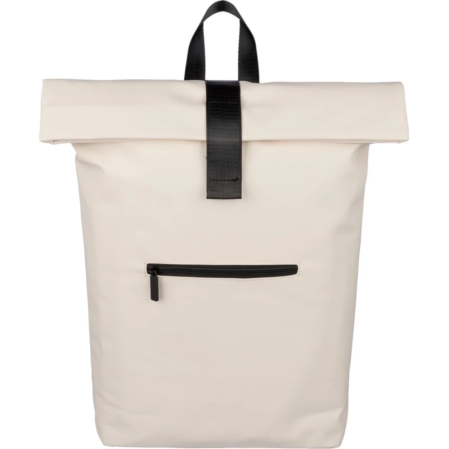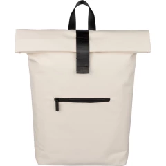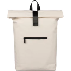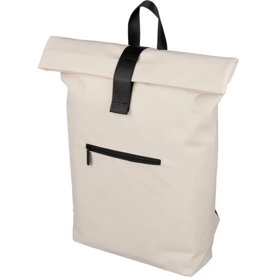 Zwijany plecak o pojemności 19 litrów, mała kieszeń zapinana na zamek z przodu, zwijana główna kieszeń zamykana na rzep, przegroda na laptopa 16" w środku, regulowane wentylowane paski na ramię, uchwyt z wierzchu ułatwiający noszenie, podszewka z poliestru 210D, ikona recyklingu na metce, produkt wykonany z PU z recyklingu i poliestru
