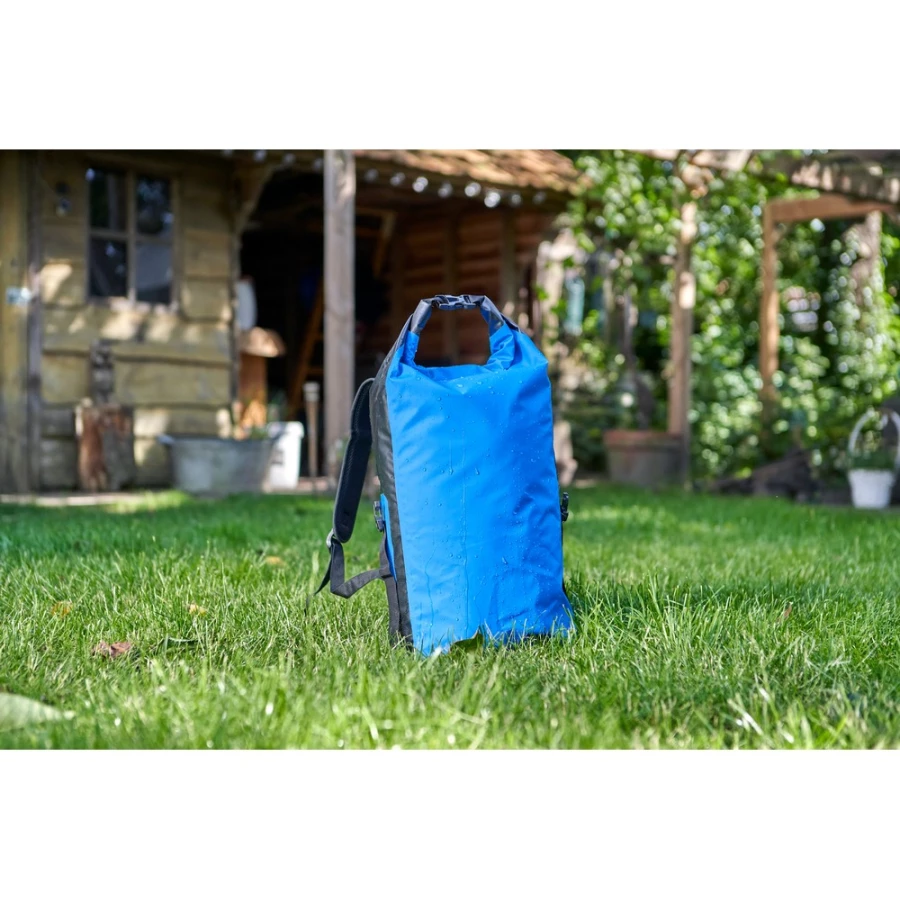 Plecak zwijany, wodoodporny, rozwijalna główna kieszeń zamykana na klamrę, która umożliwia zwiększanie pojemności plecaka oraz lepiej chroni przed czynnikami atmosferycznymi po zwinięciu, posiada regulowane, wzmocnione paski i wzmocniony spód, uchwyt ułatwiający noszenie, produkt wykonany między innymi z poliestru